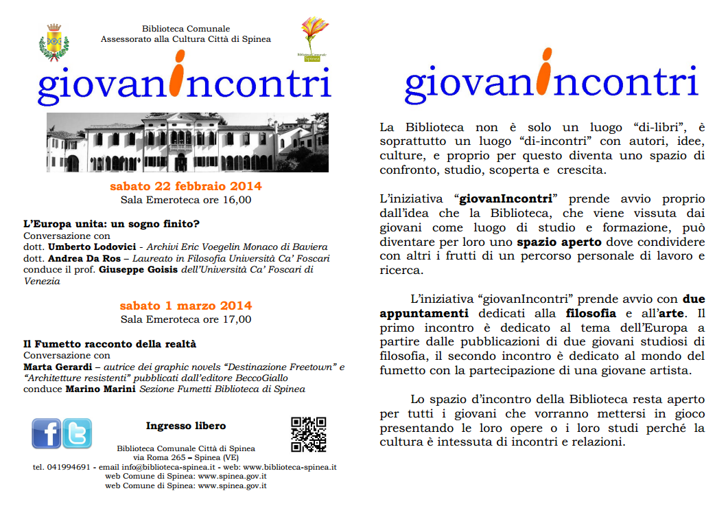 L'associazione Studenti Universitari di Spinea invita tutti a partecipare agli incontri proposti dalla Biblioteca Comunale di Spinea. Nel flyer è chiaro che si tratta di incontri a tema: il primo incontro si intitola "L'Europa: un sogno finito?" ed il secondo "Il Fumetto racconto della realtà". Entrambi gli incontri si rivolgono ad un pubblico giovanile, da cui prende il titolo dell'iniziativa "GiovanIncontri".